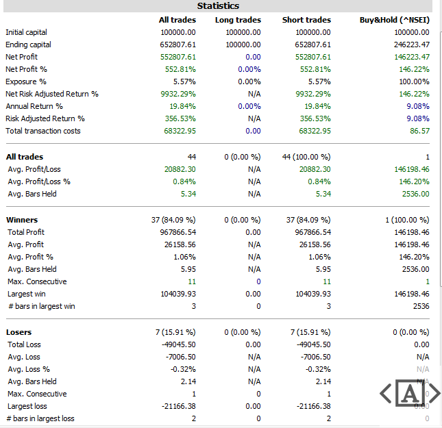 Annual Return % (CAR): The compounded annual return provides a snapshot of your strategy’s effectiveness over a year.